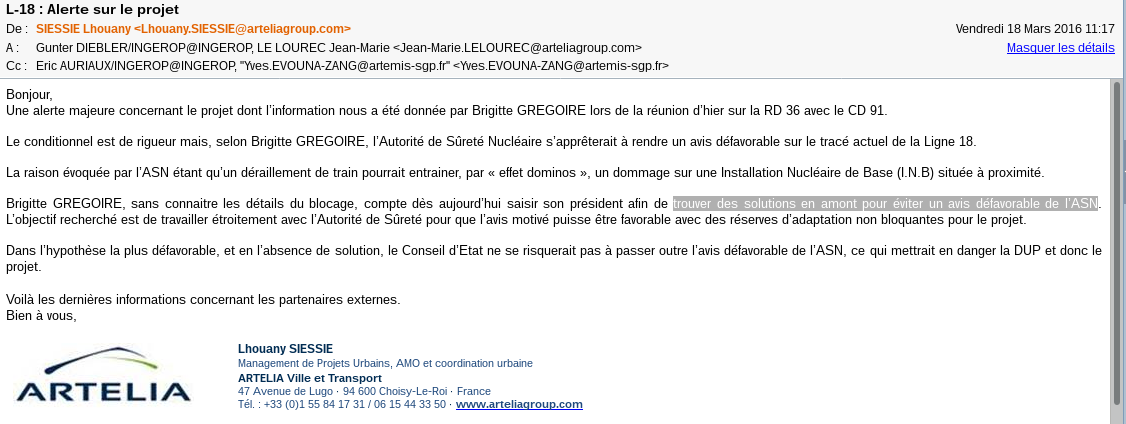 Parmis eux, un mail assez instructif envoyé par un.e employé.e d’Artelia* en mars 2016 dans le cadre de la construction de la ligne 18 du métro parisien. D’après ce qu’on comprend de ce mail, en mars 2016 l’ASN (Autorité de Sûreté Nucléaire) s’apprêtait à rendre un avis défavorable sur le tracé envisagé de la ligne 18, par crainte qu’un déraillement de train endommage une installation nucléaire située à proximité.